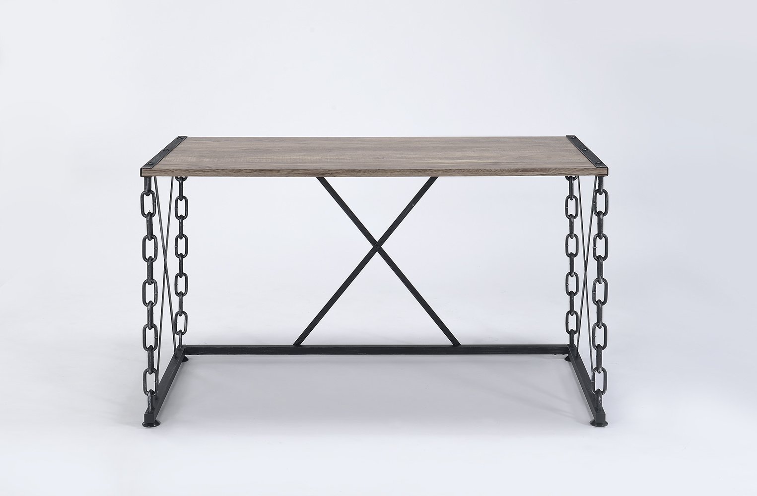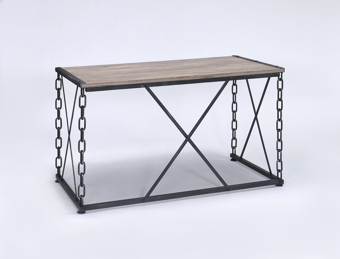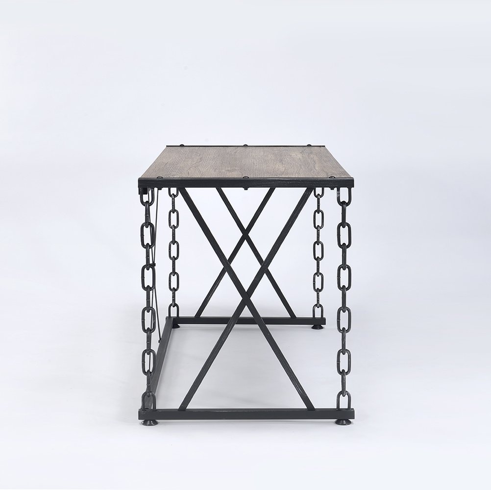 RomanceComplete your office with the stylish Jodie desk, features antique rustic oak finish with antique black industrial metal chain frame. This piece offers a new take on your average workspace. A unique and appealing look will add an instant contemporary feel to any space. Product Details•KD, Rectangular Desk (NO Storage)•Wooden Top: Oak Melamine Paper w/PB (No Apron)•Industrial Chain Metal Base: Black Antique w/Silver Brush Table Chain Legs (1.0" x 0.5"), (Leg Chain & "X" support) (No Drw/No Shelf)