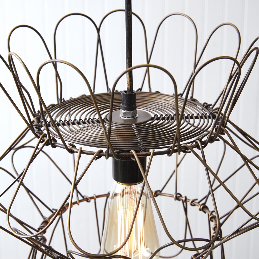 A classic French farmhouse basket takes a twist for this small pendant lamp. Its scalloped edges and wire features give it an antique look, all while being a trendy lamp. Wire and canopy has an antique brass finish. Requires a standard light bulb, not included. 60-watts is the maximum suggested bulb wattage for this item. Item must be hardwired.
